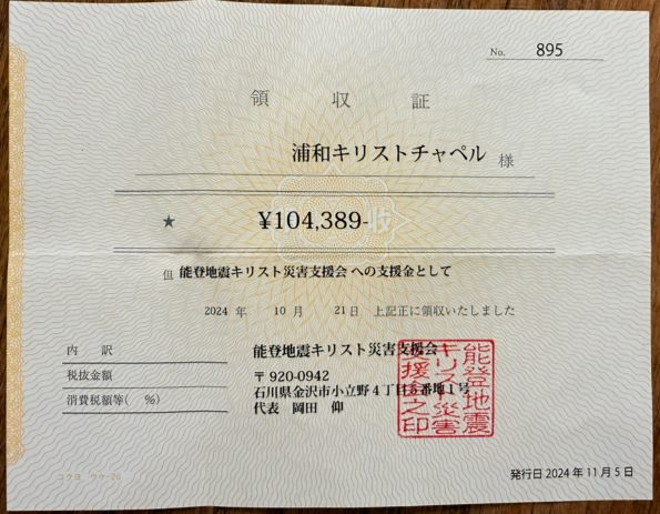 コンサートでチャリティー104,389円が集まり、翌日10/21に「能登ヘルプ」に全額送金いたしました。